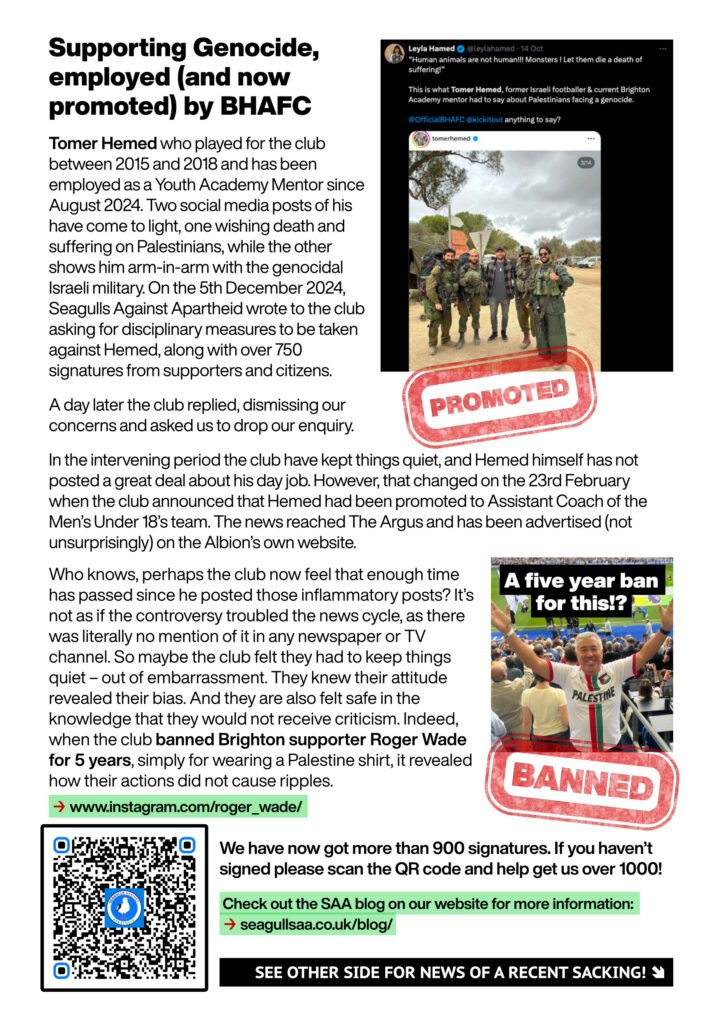 You might have seen news recently that former BHAFC player, Tomer Hemed has become the current assistant coach to the Under 18s Men’s team. Instead of punishing Mr Hemed for his racist and genocidal social media comments in October 2024, BHAFC are now promoting him. If you haven’t already – please sign our petition demanding that the club sanction the former player, and not reward him > Sign our petition