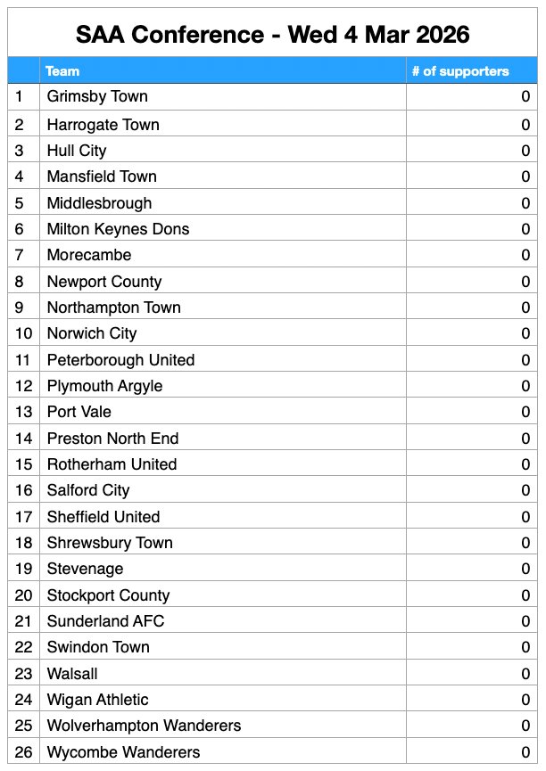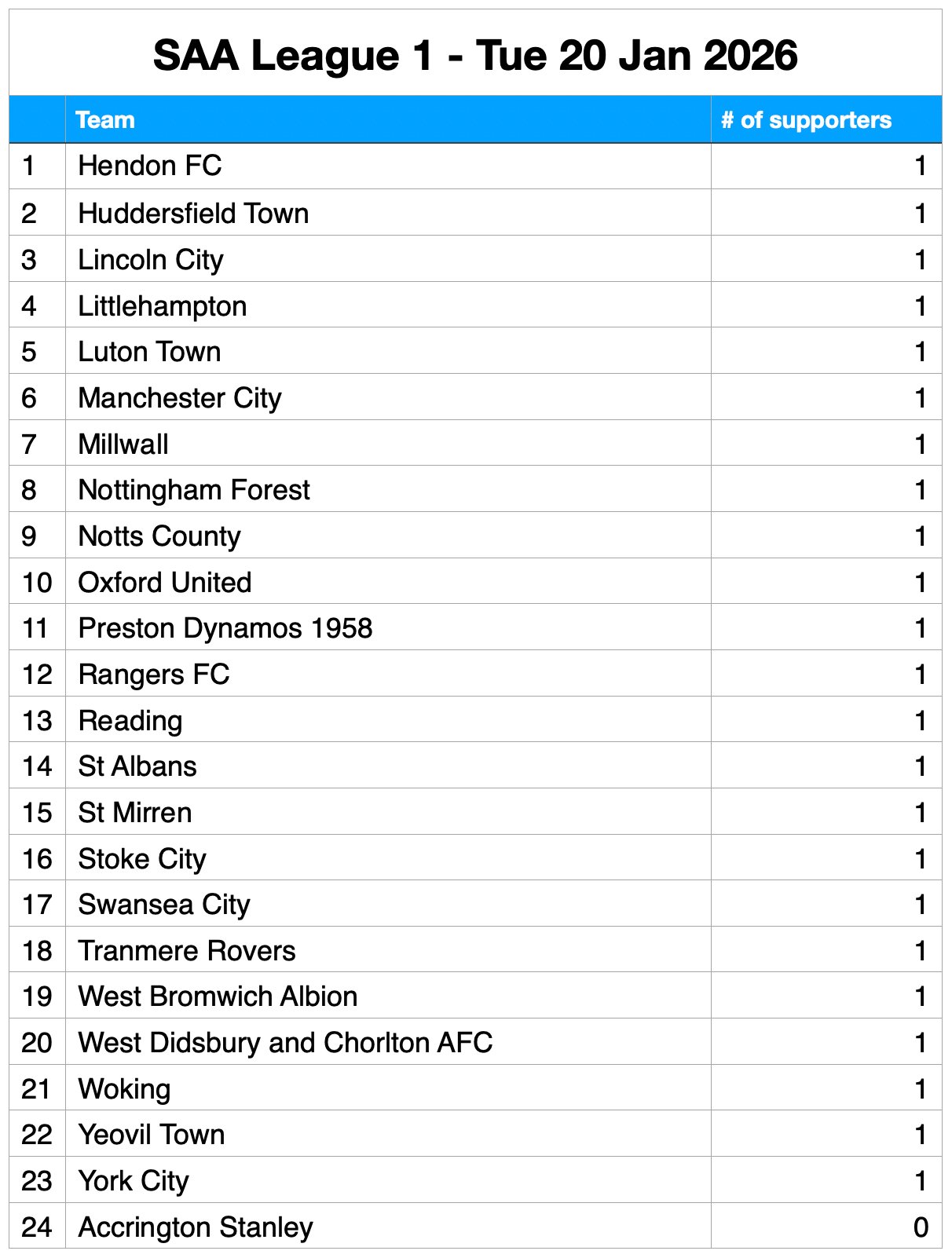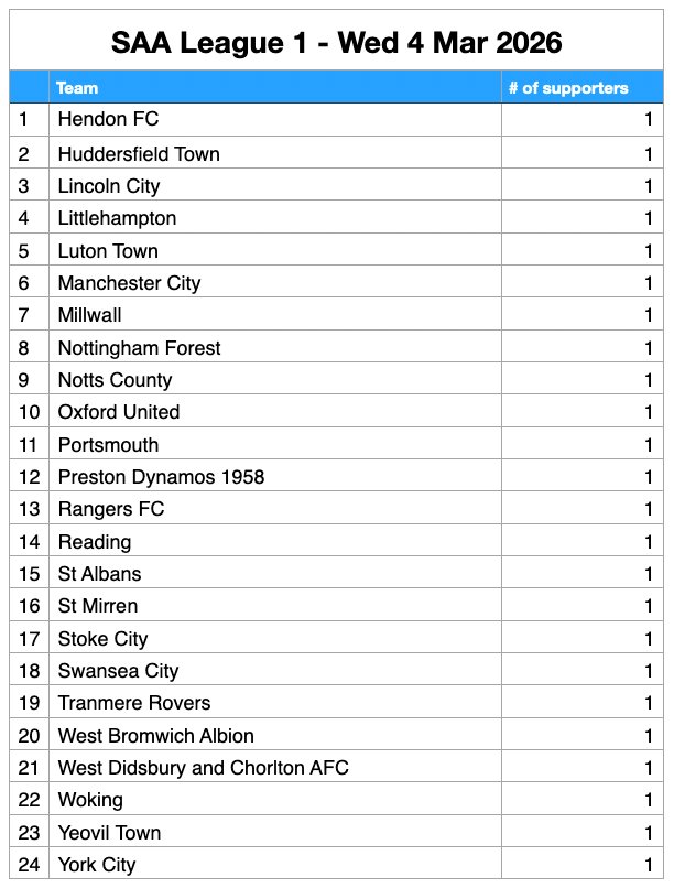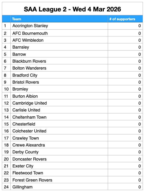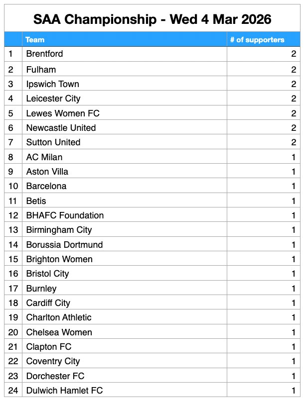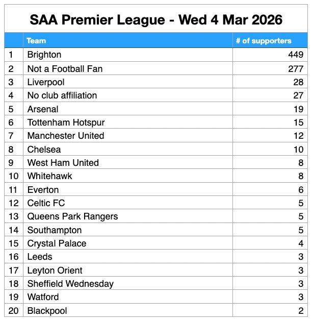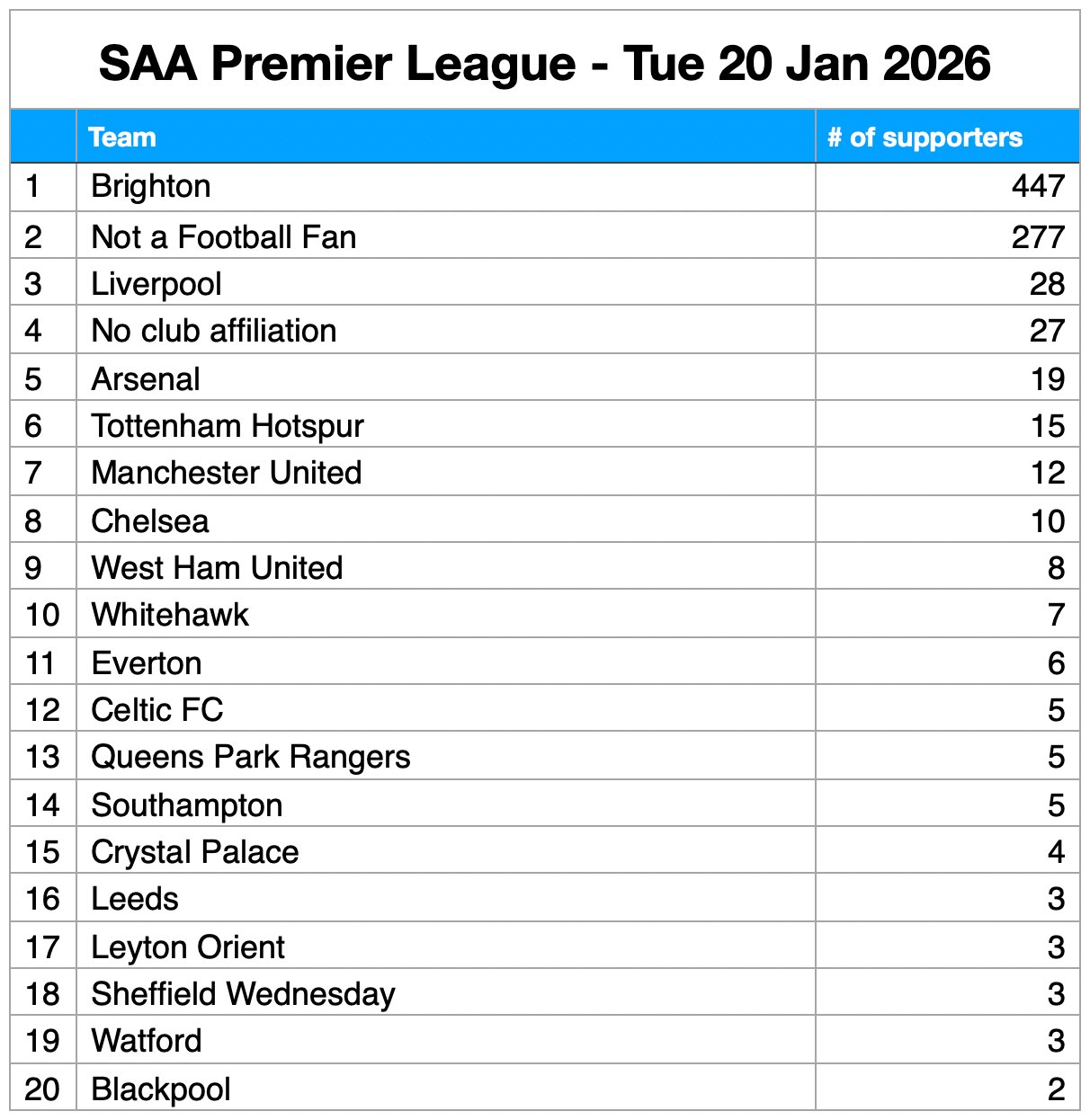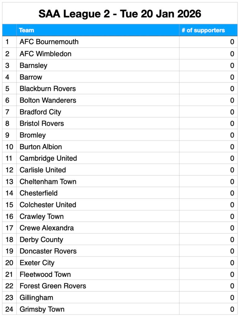 It’s no surprise to see BHAFC supporters at the top of the pile – with a healthy lead. But what of other supporters’ club affiliations? Who makes the Top 6, who’s comfortably in mid-table, and who is in danger of dropping down to the Championship?*